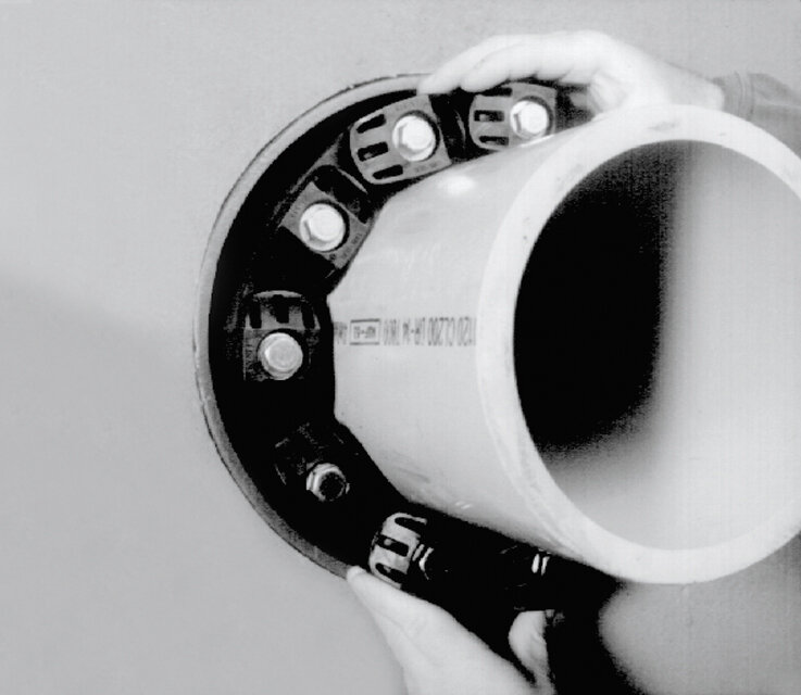 Instalare: După introducerea lanțului de legătură și trecerea tevii de alimentare, strângeți șuruburile în sensul acelor de ceas, unul după altul. Strângeți fiecare șurub cate-o tura, de mai multe ori, astfel încât inelul de etanșare să fie presat uniform.